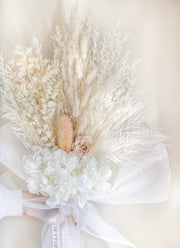 This dried neutral flower bouquet includes ruscus, mountain fern, large thistle, misty, bunny tails, tiki fern, sola rose and hydrangea.