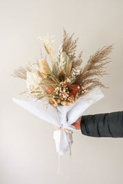 This small dried native flower bouquet includes dried banksia, palm spears, misty, pampas, tiki fern, ruscus, daisies, thistle and wheat.