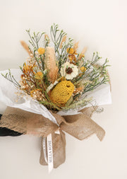 This small dried native bouquet includes banksia, kangaroo paw, thistle, billy buttons, bunny tails, fern, baby's breath, anemone, wheat and misty.