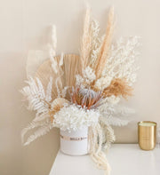 Featuring dried hydrangea, king protea, bunny tails, pampas grass, ming fern, misty, baby's breath, hanging amaranthus, fan palm, mini fern, tiki fern and mountain fern. Placed in a white vase.