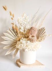 Featuring neutral dried flowers, including: dried hydrangea, sun palm, bunny tails, pampas grass, baby's breath, ruscus, palm spear, aveena and dried banksia. It comes in a matte white vase.
