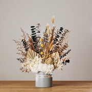 Featuring native dried flowers, including: hydrangea, dried banksia, palm spears, billy buttons, misty, dried eucalyptus leaves, preserved eucalyptus, everlasting daisies, natural bunny tails and ming fern. It comes in a matte grey vase.