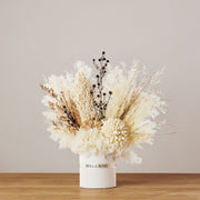 Featuring dried hydrangea, sorghum, stirlingia, bunny tails, misty, ming fern, baby's breath, and magnolia. Placed in a white vase.